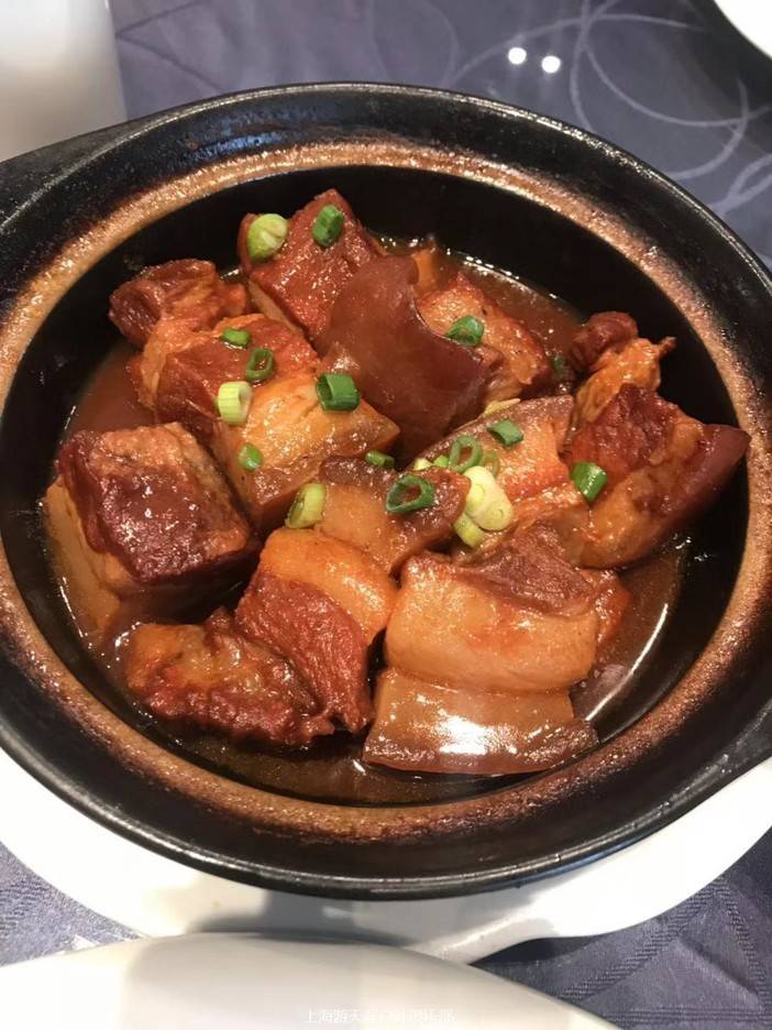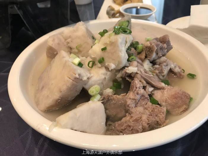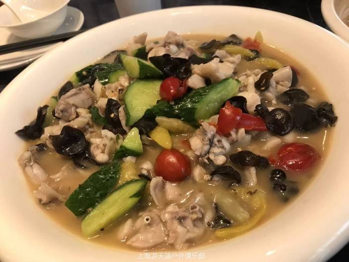 午餐菜单:芋艿排骨、泡椒牛蛙,蒋家东坡肉、白斩鸡、亭下湖鱼头(或者野生扁鱼),干锅花菜,干煸四季豆,千叶豆腐、蕃茄蛋汤、耗油生菜,每桌一瓶雪碧,米饭