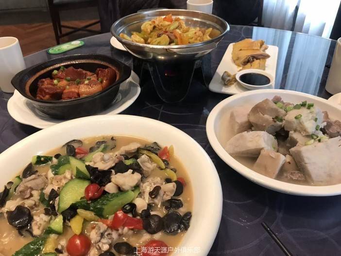 午餐菜单:芋艿排骨、泡椒牛蛙,蒋家东坡肉、白斩鸡、亭下湖鱼头(或者野生扁鱼),干锅花菜,干煸四季豆,千叶豆腐、蕃茄蛋汤、耗油生菜,每桌一瓶雪碧,米饭