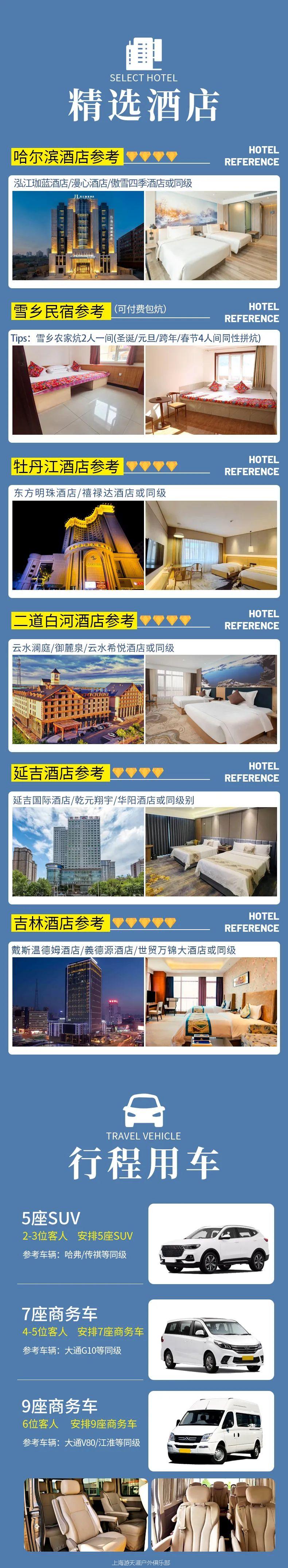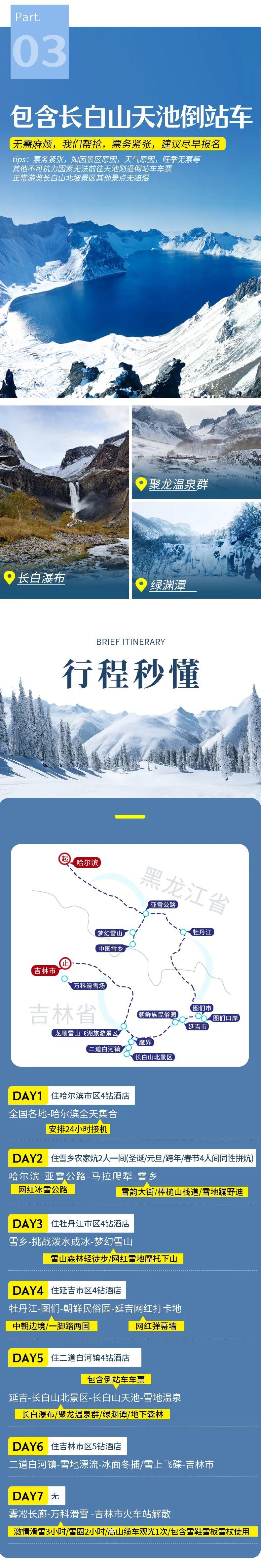 5、长白山由于冬季火爆限流前往,票务紧张,建议尽早报名好提前帮抢长白山天池倒站车票;如因景区原因、天气原因、旺季无票或者其他不可抗力因素无法前往则取消前往,退倒站车费用,其他景点正常游览无退费无赔偿。