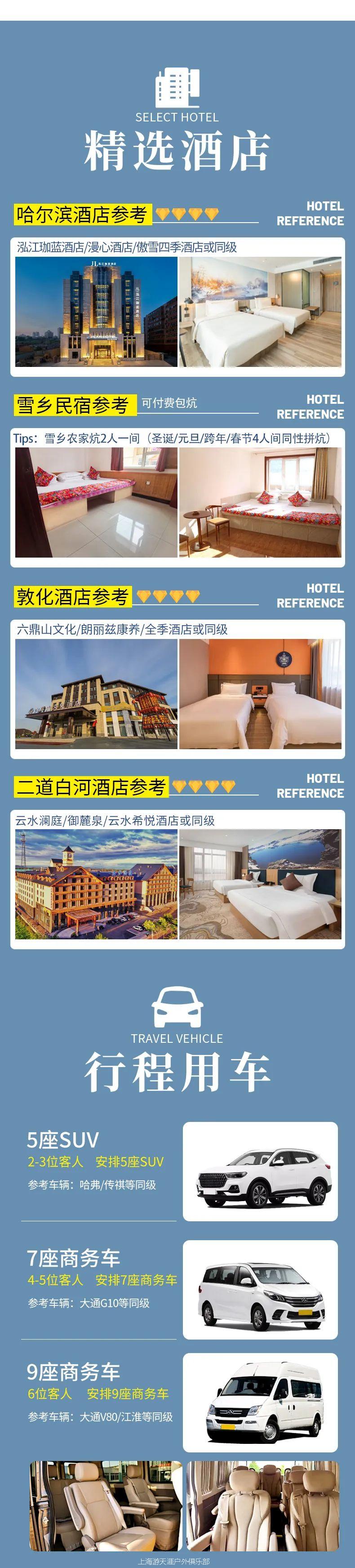 5、长白山由于冬季火爆限流前往,票务紧张,建议尽早报名好提前帮抢长白山天池倒站车票;如因景区原因、天气原因、旺季无票或者其他不可抗力因素无法前往则取消前往,退倒站车费用,其他景点正常游览无退费无赔偿。