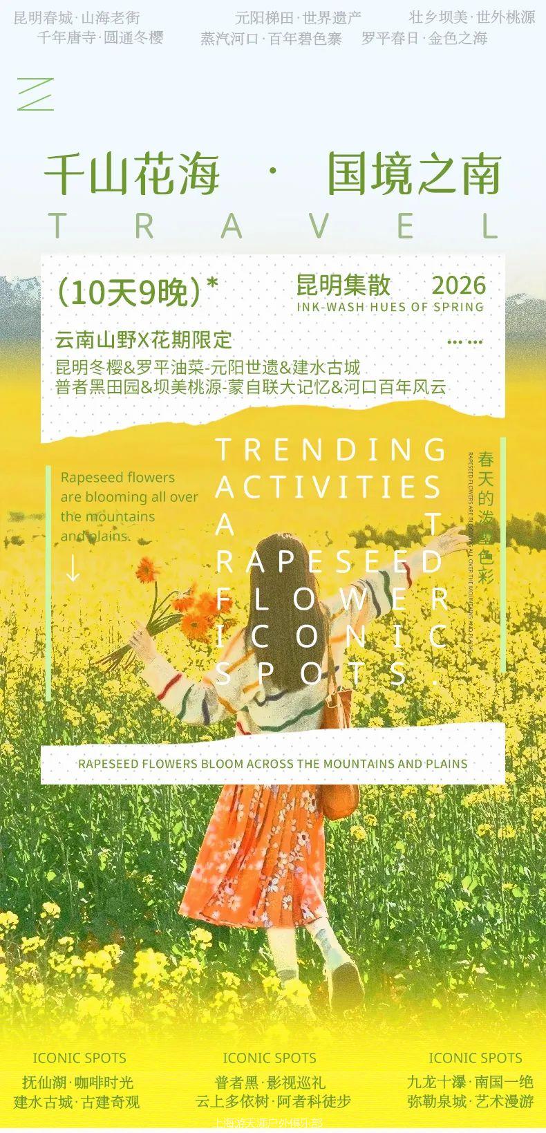 13:00 抵达【罗平油菜花主会场】。罗平有两项“油菜花之最”,一是有国内最早的油菜花季,一般从每年二月初开始,持续到三月底四月初,是年初赏花的著名油菜花旅游目的地。二是罗平是吉尼斯世界纪录认证的“世界最大的自然天成花园”,这个花园最多的花自然是油菜花,光是连成片的油菜花就达二十万亩,被称为油菜花海也不为过。我们在这里为大家赠送【花田小火车】体验,在油菜花海留下一次难忘的回忆。