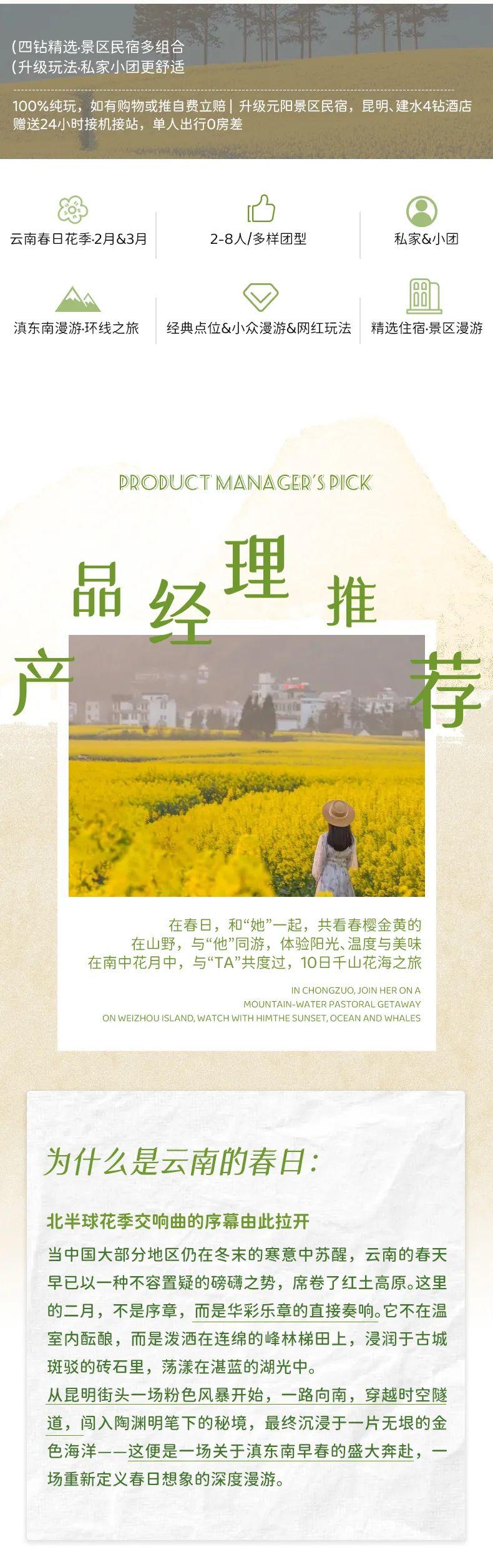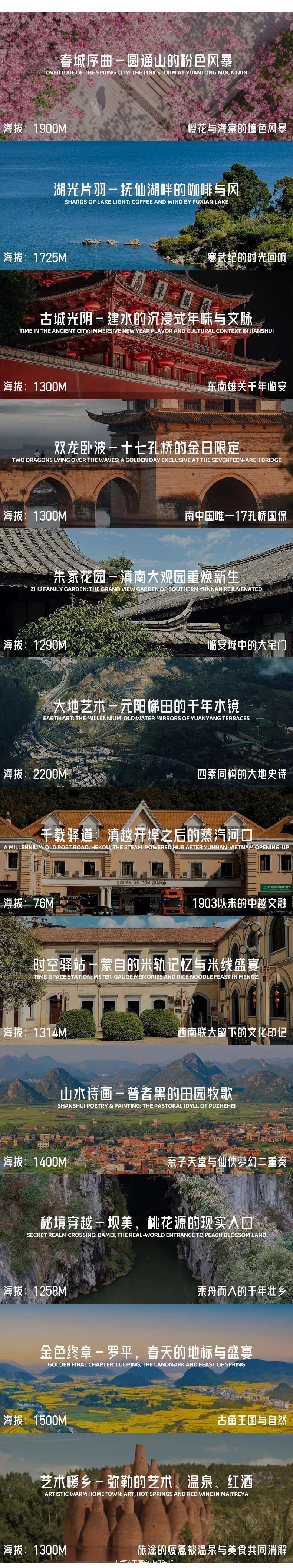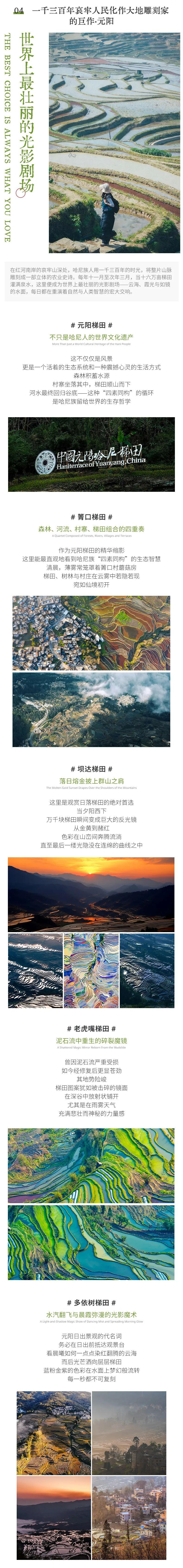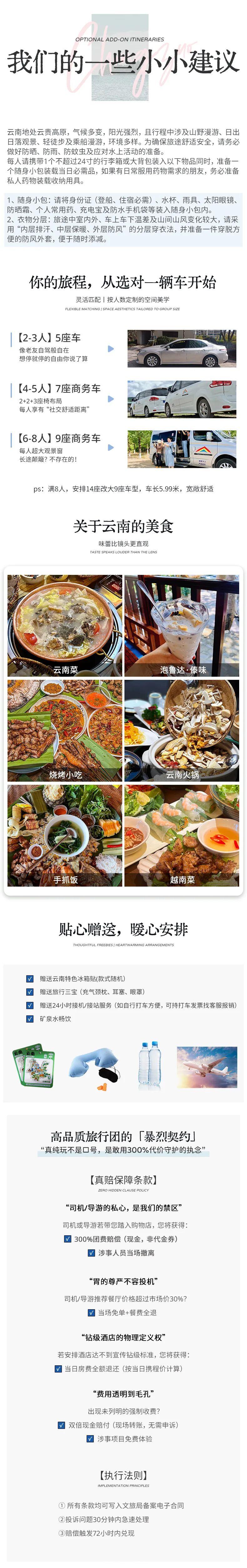 4、门票:圆通山,禄充,朱家花园,元阳,阿者科(含向导),加极寨,碧色寨,三生三世,坝美,金鸡峰,九龙瀑布,东风韵,抚仙湖下午茶;