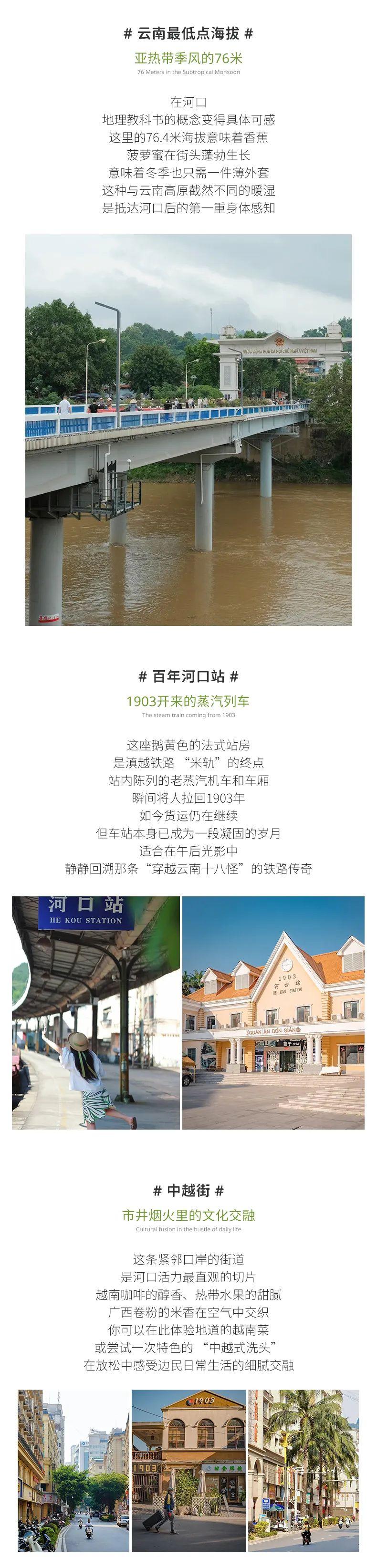 09:30 前往【103号界碑】,界碑如同沉默的卫士,矗立于此宣示着国家领土的主权。其碑身上的数字是独一无二的“身份号码”,而编号后若带括号(如“1”),则通常表示这是以河流为界时,在边界线某一侧竖立的“双立界碑”或“三立界碑”中的一块。在这里,你可以真正体验“一步之遥,两国之间”的地理实感。随后抵达的这片红河与南溪河交汇的河口,海拔仅76.4米,是云南地理的“最底端”【云南最低海拔点】。站在这里,与省内海拔6740米的最高点——卡瓦格博峰直线相距约900公里,海拔落差却超过6000米,亲身感受云南“一省之地,囊括四季”的极致立体气候。最后,目光聚焦于这座承载百年风云的钢铁动脉。【中越铁路大桥】始建于1903年,是第一条连接中国西南与海外的滇越铁路的关键节点。它历经三次被毁与重建,至今仍横跨南溪河,桥中央即是国界。凝视这座被誉为“世界工程奇迹”之一的百年米轨桥,仿佛能听见历史与现代贸易列车并行的轰鸣。。