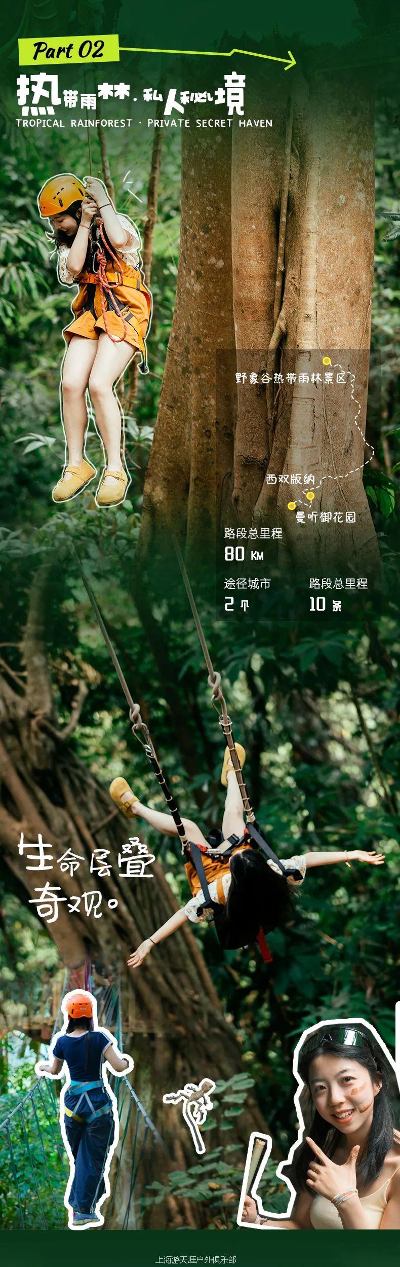 14:00 开始【林间秋千】,抓住藤蔓纵身跃入山谷,失重感撕开满目苍翠。风声裹挟着野象的远鸣掠过耳际,在最高点瞥见澜沧江如银练绕林而过——这瞬间的飞翔,胜过所有人工乐园的刺激。