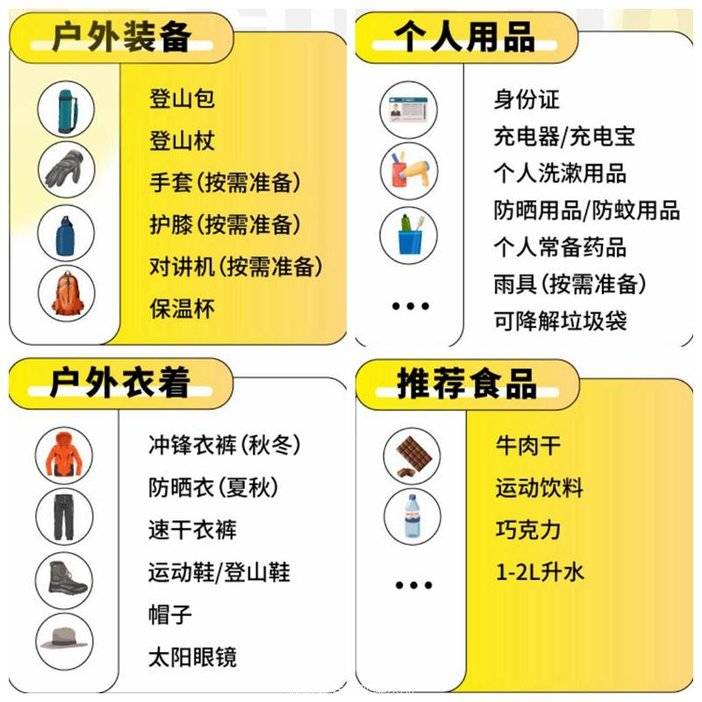 双肩背包、防雨罩(可选),雨衣或雨披、登山鞋或徒步鞋或运动鞋、登山杖(可选),垃圾袋、身份证件。